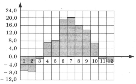 Ha диаграмме показана среднемесячная температура воздуха в Санкт-Петербурге за каждый месяц 1999 года. По горизонтали указываются номера месяцев, по вертикали — температура в градусах Цельсия. Определите по диаграмме, сколько месяцев второго полугодия 1999 года средняя температура была ниже 15 °С.![]() | |||